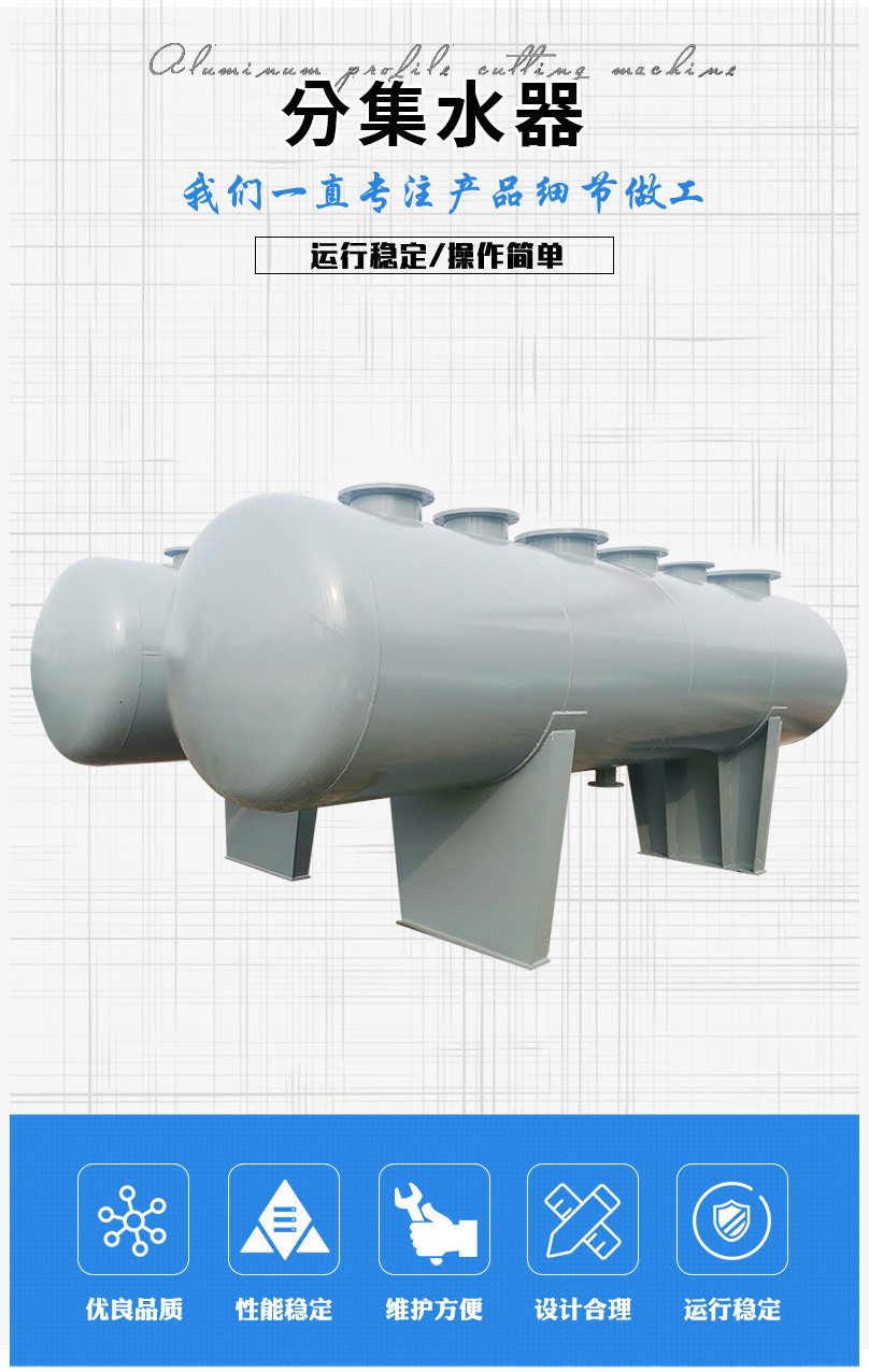 結(jié)構(gòu)由主管、分路支管、排污口、排氣口、壓力表、溫度計等組成。直徑較大的筒體上裝有人孔或手孔,材質(zhì)由碳鋼板卷制,或無縫鋼管制作而成,能承受一定壓力,屬于壓力容器類專業(yè)制造,外表面做防腐或保溫處理。